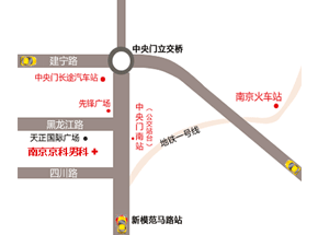 南京站:步行至南京车站,乘坐56路,在中央门南站下车。乘坐地铁1号线(奥体中心方向)(或地铁1号线南延线(中国药科大学方向)),在新模范马路站下车(2号出口)。